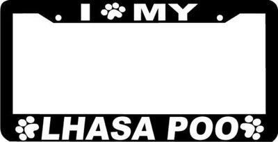 LHASA POO PAW PRINT DOG License Plate Frame Plastic License Plate Frame Polystyrene plastic with vinyl graphics. Strong with tabs on the back to secure your plate to the frame. This is a buy it now for the frame pictured It is designed to fit a US/CANADA license plate.