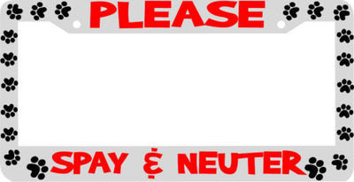 PLEASE SPAY NEUTER pet dog paw License Plate Frame Plastic License Plate Frame Polystyrene plastic with vinyl graphics. Strong with tabs on the back to secure your plate to the frame. This is a buy it now for the frame pictured It is designed to fit a US/CANADA license plate.