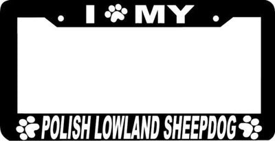 POLISH LOWLAND SHEEPDOG paw print License Plate Frame Plastic License Plate Frame Polystyrene plastic with vinyl graphics. Strong with tabs on the back to secure your plate to the frame. This is a buy it now for the frame pictured It is designed to fit a US/CANADA license plate.