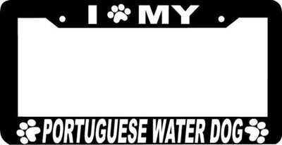 PORTUGUESE WATER DOG paw print License Plate Frame Plastic License Plate Frame Polystyrene plastic with vinyl graphics. Strong with tabs on the back to secure your plate to the frame. This is a buy it now for the frame pictured It is designed to fit a US/CANADA license plate.