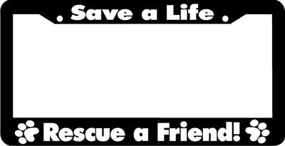 SAVE A LIFE RESCUE A FRI License Plate Frame Plastic License Plate Frame Polystyrene plastic with vinyl graphics. Strong with tabs on the back to secure your plate to the frame. This is a buy it now for the frame pictured It is designed to fit a US/CANADA license plate.