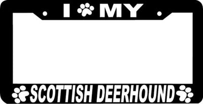 SCOTTISH DEERHOUND DOG paw print License Plate Frame Plastic License Plate Frame Polystyrene plastic with vinyl graphics. Strong with tabs on the back to secure your plate to the frame. This is a buy it now for the frame pictured It is designed to fit a US/CANADA license plate.