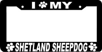 SHETLAND SHEEPDOG DOG paw print License Plate Frame Plastic License Plate Frame Polystyrene plastic with vinyl graphics. Strong with tabs on the back to secure your plate to the frame. This is a buy it now for the frame pictured It is designed to fit a US/CANADA license plate.