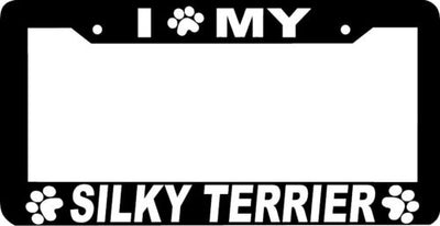 SILKY TERRIER DOG paw print License Plate Frame Plastic License Plate Frame Polystyrene plastic with vinyl graphics. Strong with tabs on the back to secure your plate to the frame. This is a buy it now for the frame pictured It is designed to fit a US/CANADA license plate.