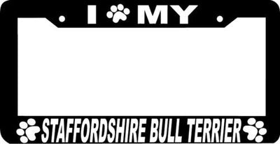 STAFFORDSHIRE BULL TERRIER DOG paw print License Plate Frame Plastic License Plate Frame Polystyrene plastic with vinyl graphics. Strong with tabs on the back to secure your plate to the frame. This is a buy it now for the frame pictured It is designed to fit a US/CANADA license plate.