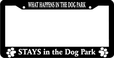 WHAT HAPPENS IN THE DOG PARK STAYS woof paw print funny dog License Plate Frame