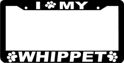 WHIPPET DOG PAW PRINT License Plate Frame Plastic License Plate Frame Polystyrene plastic with vinyl graphics. Strong with tabs on the back to secure your plate to the frame. This is a buy it now for the frame pictured It is designed to fit a US/CANADA license plate.