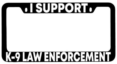 I Support K-9 Law Enforcement Black METAL License Plate Frame I Support K-9 Law Enforcement Black METAL License Plate Frame Description I Support K-9 Law Enforcement Black Metal license plate frame made from high quality steel, covered with premium outdoor color vinyl printing with a minimum life expectancy of 7 year. The vinyl is designed to stand up to the elements and will not peel off in car washes or other elements your car may be subjected to. This frame is designed to last. Designed to withstand outdoor conditions We do all kinds of different products.