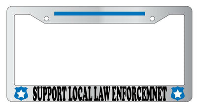 Support Local Law Enforcement w/STRIPE Chrome Plastic License Frame Support Local Law Enforcement w/STRIPE Chrome Plastic License Frame Description Support Local Law Enforcement w/STRIPE Chrome Plastic license plate frame made from high impact ABS plastic, chrome plated, and covered with color vinyl printing. This frame is designed to last. Steel chrome frames when they get scratched will rust and rot away. These frames will last longer than your car.