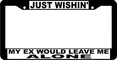 JUST WISHIN' MY EX WOULD LEAVE ME ALONE License Plate Frame Plastic License Plate Frame Polystyrene plastic with vinyl graphics. Strong with tabs on the back to secure your plate to the frame. This is a buy it now for the frame pictured It is designed to fit a US/CANADA license plate.