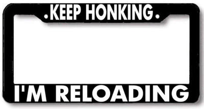 Keep Honking I'M RELOADING License Plate Frame Plastic License Plate Frame Polystyrene plastic with vinyl graphics. Strong with tabs on the back to secure your plate to the frame. This is a buy it now for the frame pictured It is designed to fit a US/CANADA license plate.