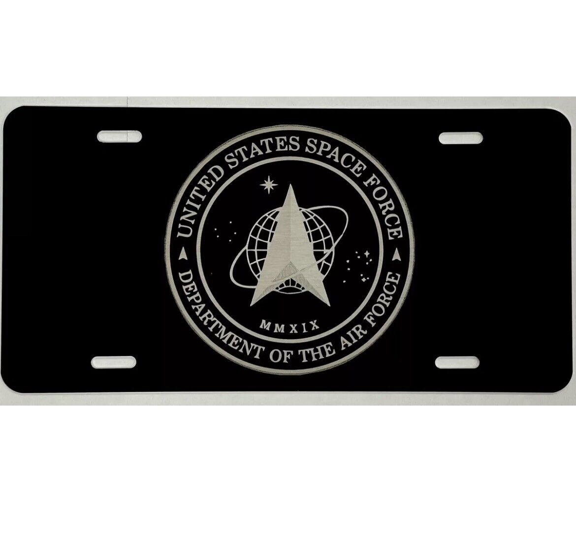 US Space Force USSF Seal Car Tag Laser Engraved Matte Black License Plate. Made in the USA Our license plates are made from aluminum and will not rust. They are painted with a high performance baked on enamel finish. We use a laser engraving process, so no worries about peeling or fading. The laser actually removes the paint to expose the aluminum metal, making for a plate that will last for years. We guarantee it! ~Made from .040 aluminum, not .025, our tags are almost twice as thick as others. ~Fits any standard size 12"x 6" mount with four slots as pictured. -includes screw caps and screws ~Plates are made to order and usually ship within 24 hours. Makes a great gift!